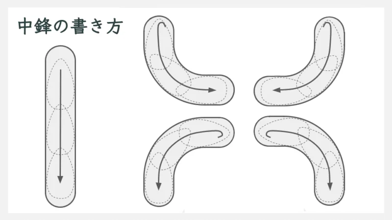 送筆は、穂先が線の中央を通るように書きます。これを中鋒といいます。